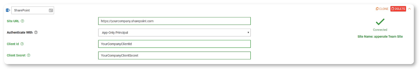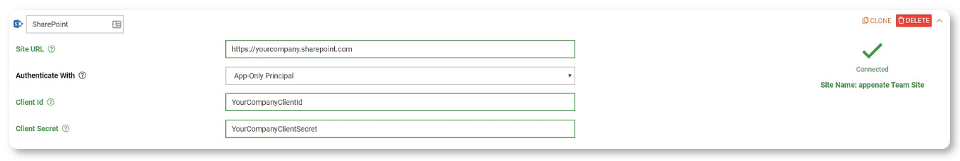 Authenticating a connection to SharePoint enables communication between the two platforms. This must be successfully added before Form Connectors (SharePoint List and Sharepoint Document) can push or Data Source Connectors can pull data.