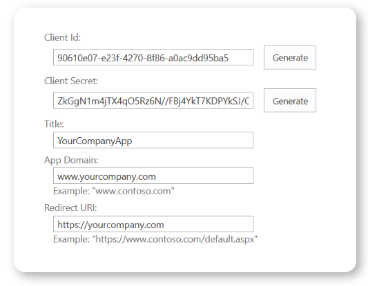 Once the page has loaded, click on the Generate button next to the Client Id and Client Secret text fields to generate valid client id and client secret credentials. Fill in the remaining required text fields as indicated in the screenshot below.