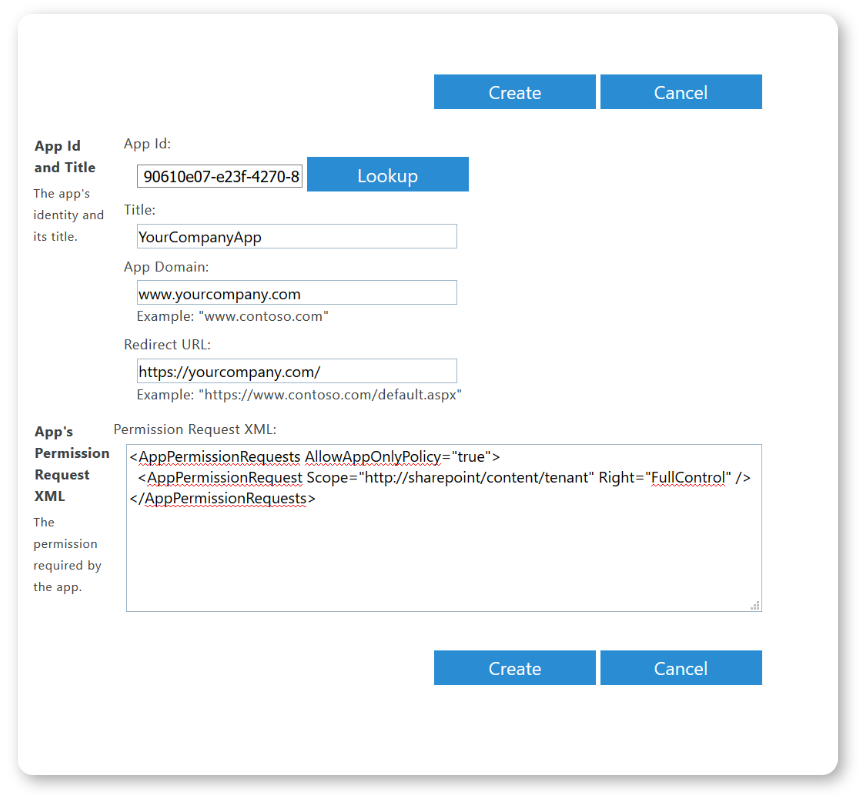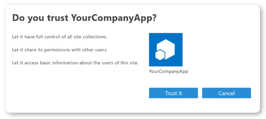 Once you've created your app permissions request, SharePoint will provide you with a dialog indicating whether you trust YourCompanyApp. Click on the Trust It button to grant the permissions.