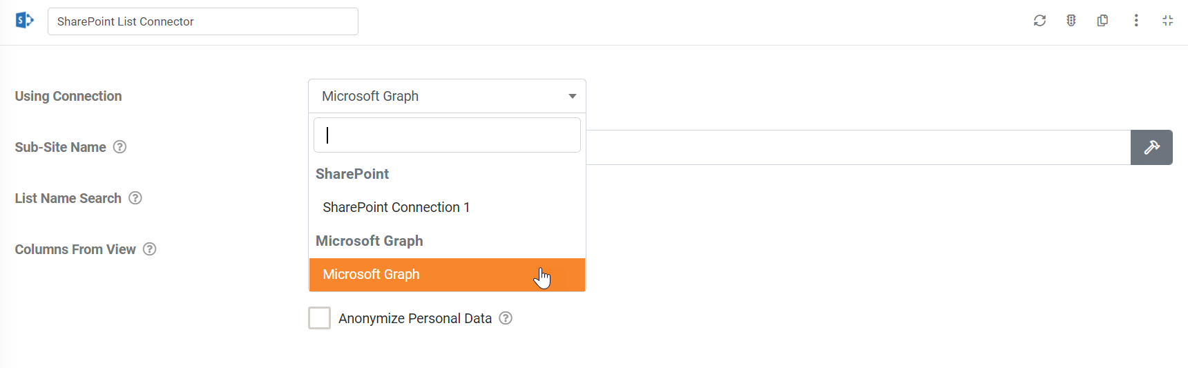 When adding a Sharepoint List Data Source Connector or any other supported MS product connector, select the MS Graph Connection instead of a Sharepoint Connection in the Using Connection dropdown.
