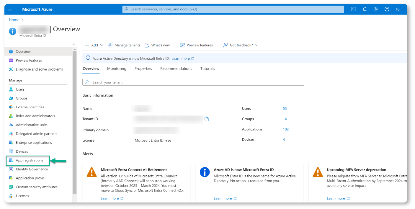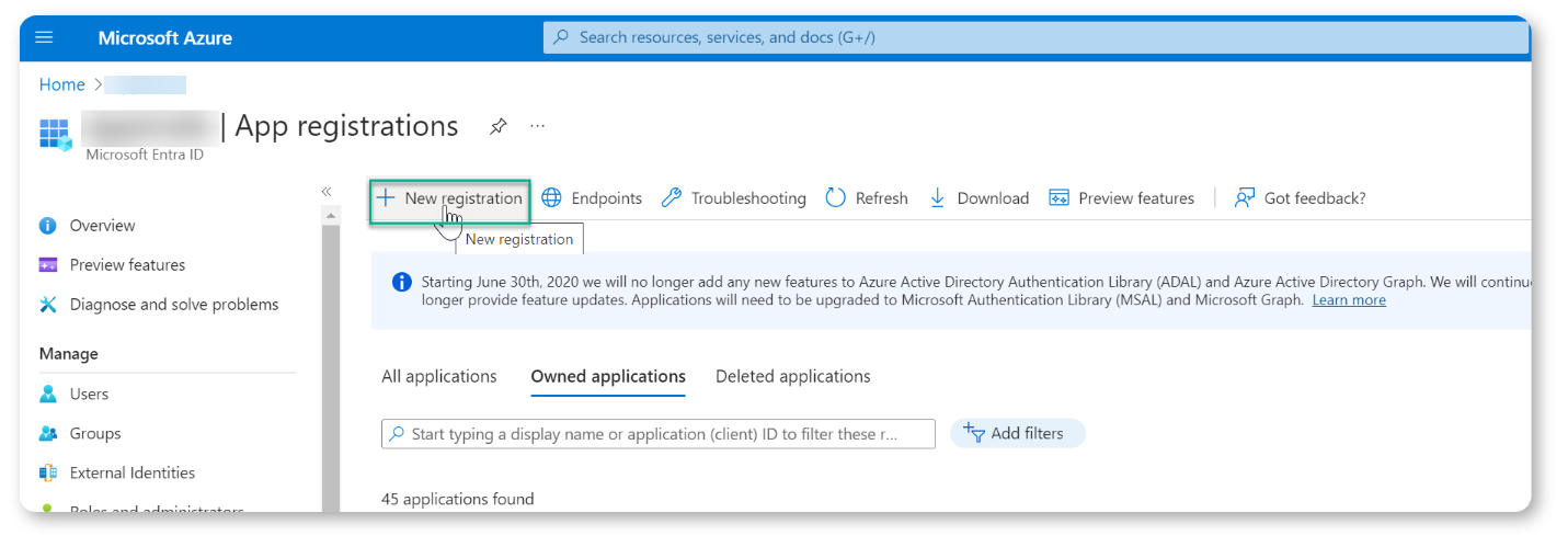 On this page, click the "App registrations" option in the main left menu to start the app registration process as shown in the screenshot below.