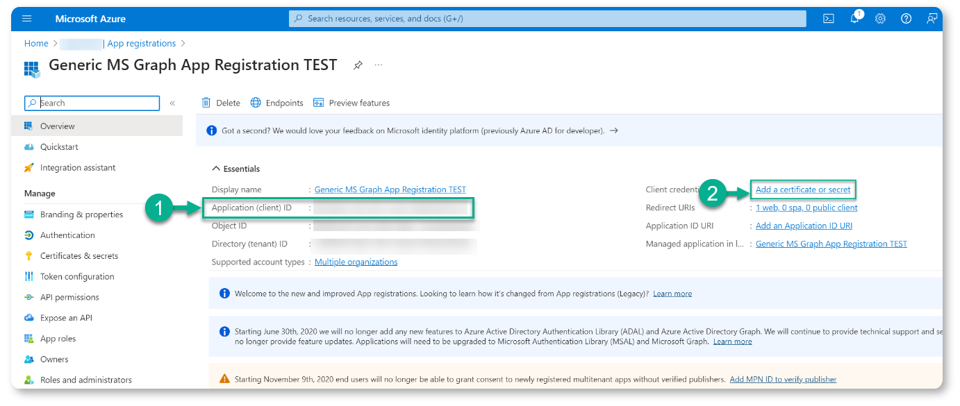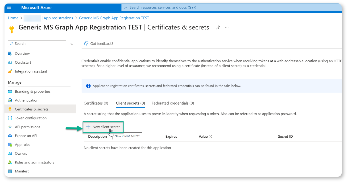 By the end of this process, you will have registered a new app on the Microsoft Azure portal, created a client secret value, and acquired all the necessary details to authenticate your MS Graph connection in our platform.
