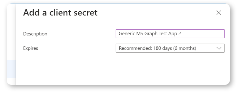 When you click on the "New client secret" button, a sidebar will open on the right of the screen, as shown in the screenshot below. Here, you will need to enter a descriptive name for this secret key and specify how long you want it to be valid. We used 180 days as a default, but you can make it longer or shorter as your organization's security rules dictate.