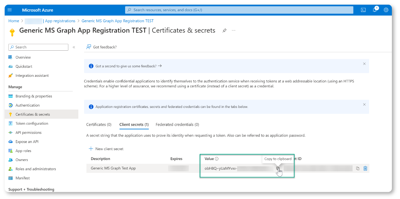 Once your changes are saved, you will be taken to the Client Secrets overview pages, where you can copy the Secret Value as shown in the screenshot below: