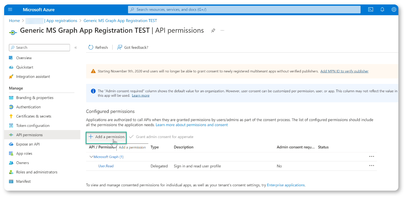 On the next page click the option to "Add a permission" to select the Microsoft Service that you wish to add permissions for.