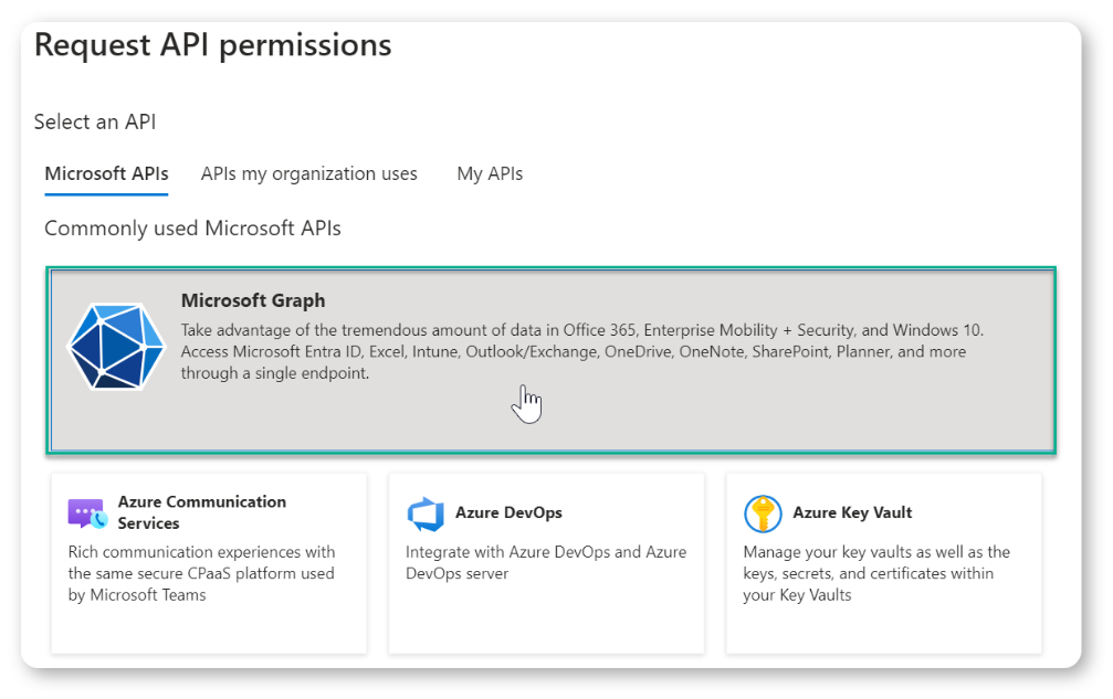 After selecting "Microsoft Graph" as the service for which you would like to configure API permissions, on the next screen, select "Delegated" or "Application" permissions, depending on your preferred authentication type.