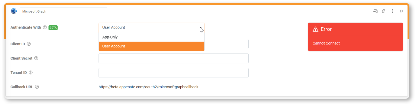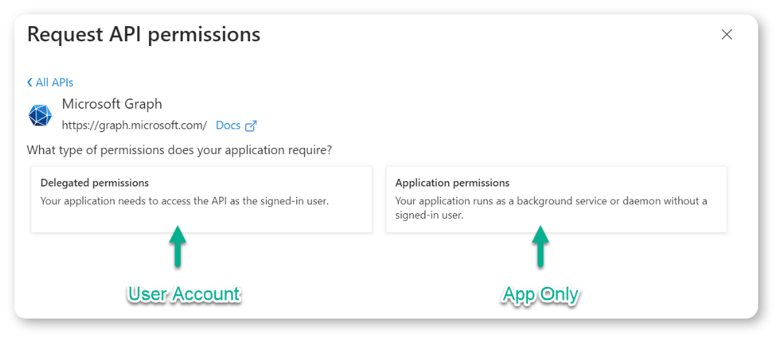 You must first decide whether to authenticate your MS Grah connection with "App-Only" permissions or with "User Account" permissions, which depends on the API permissions path taken when registering your App in the MS Azure Portal.