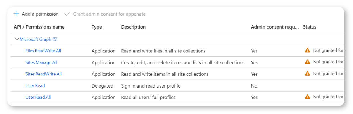 As shown in the image above, the 'Admin consent required' status is not accepted. An administrator must grant access to the API permissions where 'Yes' is required.