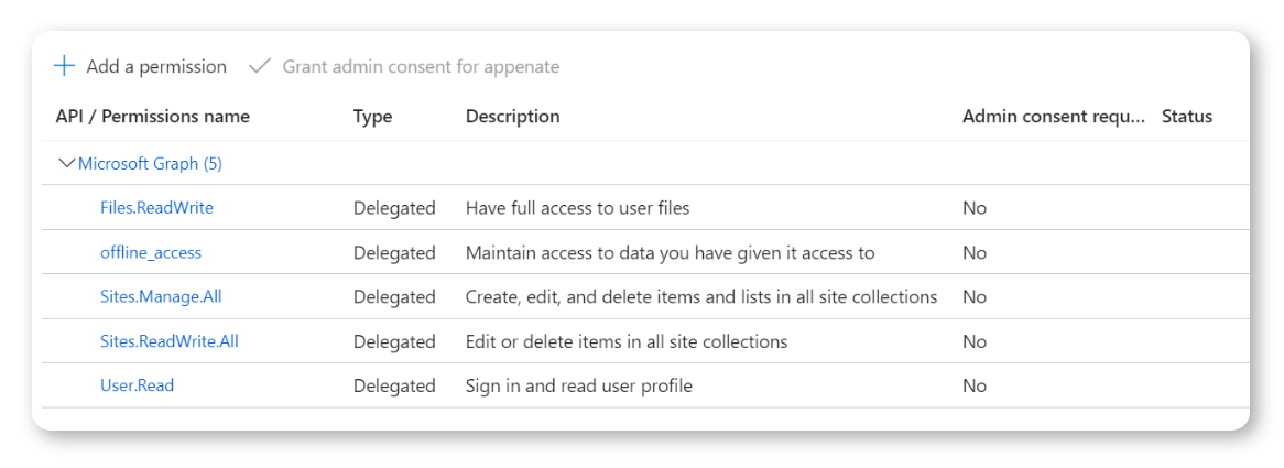 | Sharepoint or OneDrive API Permission Requirements | ||
